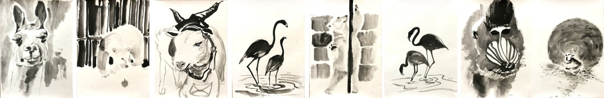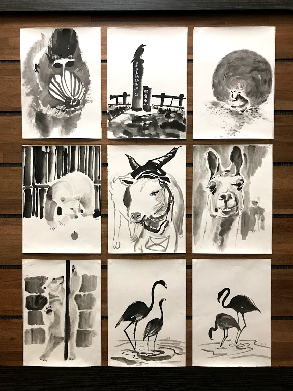「帶廣動物園」水墨 初裱 北海道動物日常/鋼管北極熊 送信山羊 大紅鶴 山魈 烏鴉